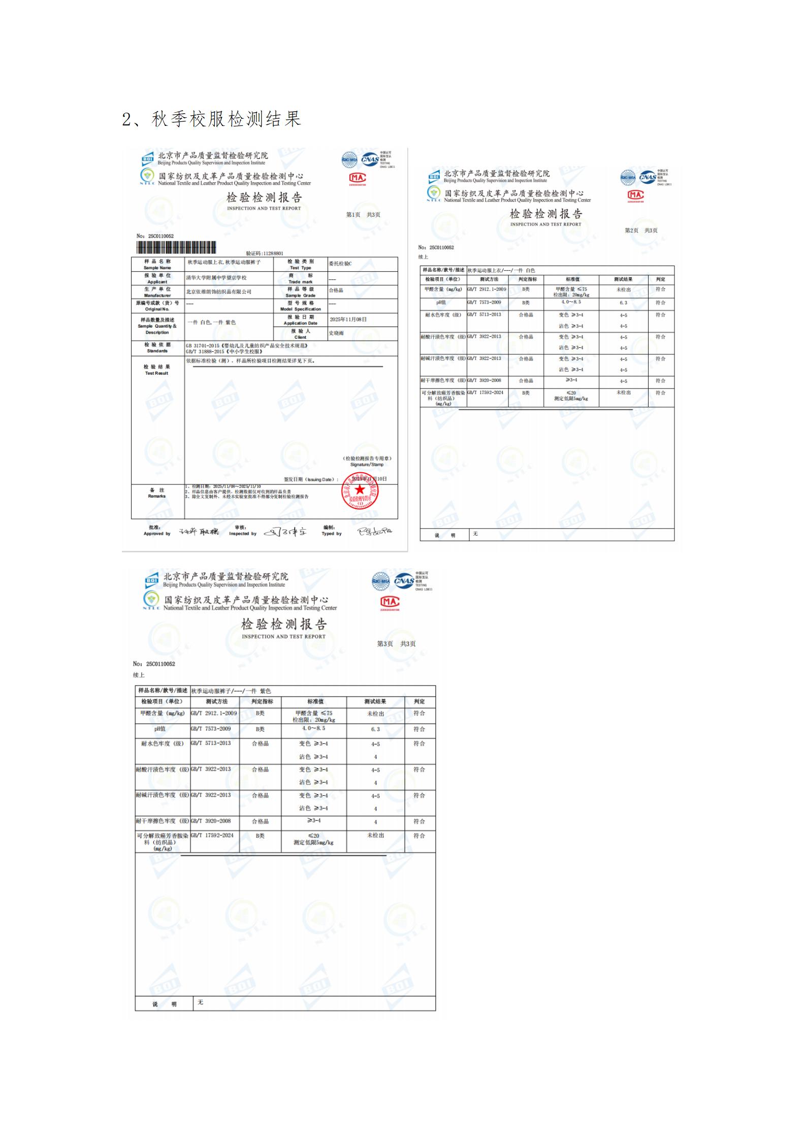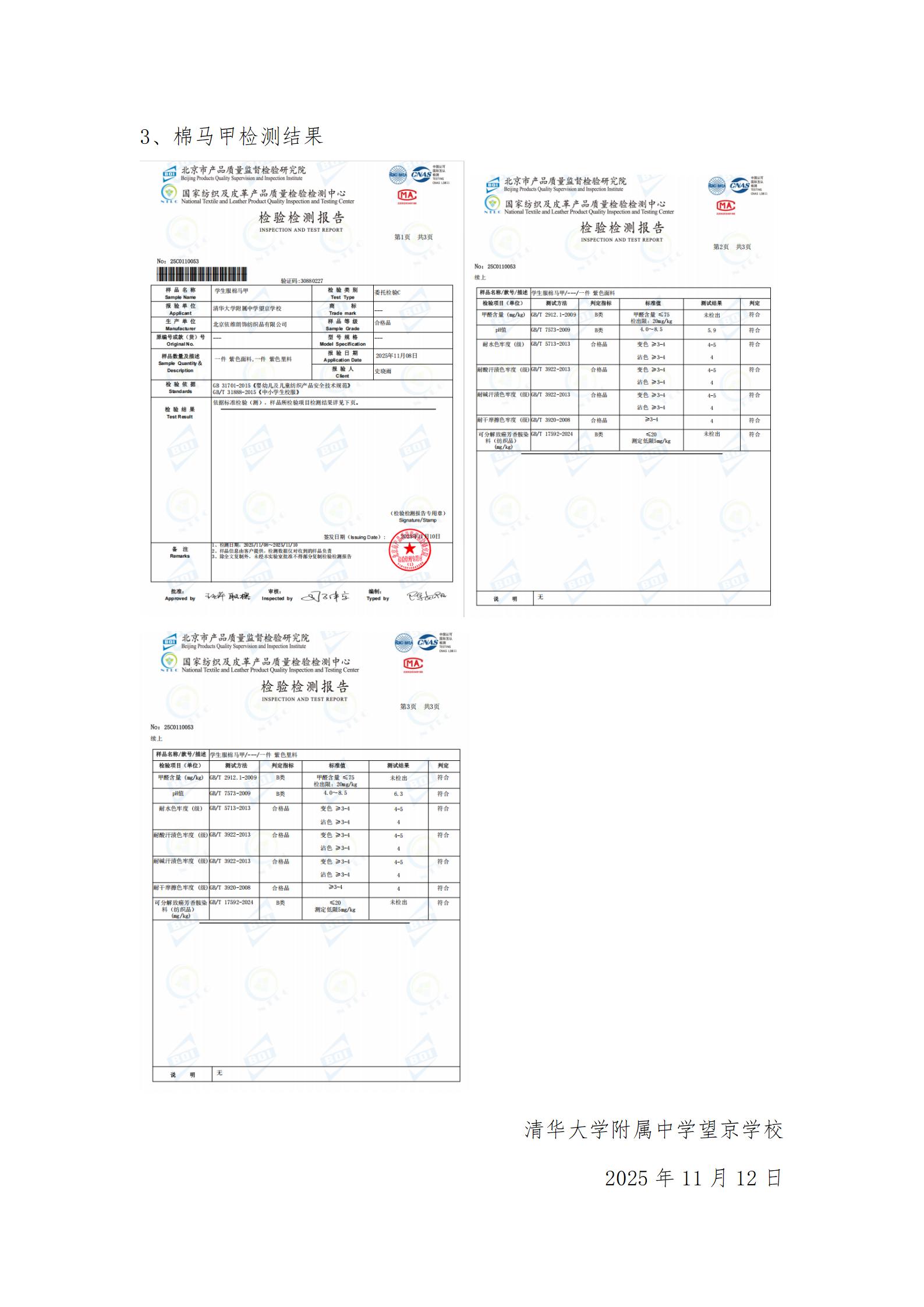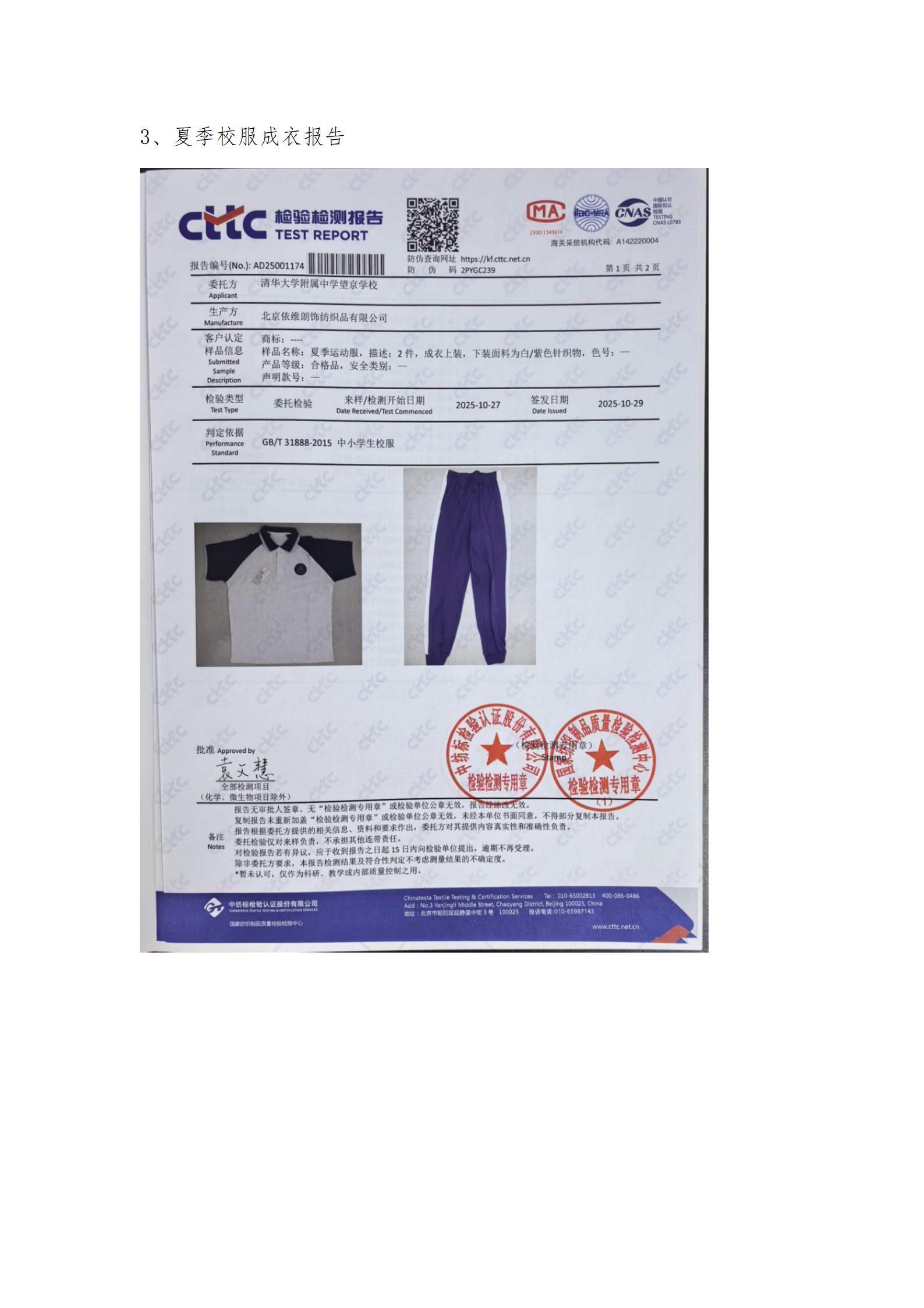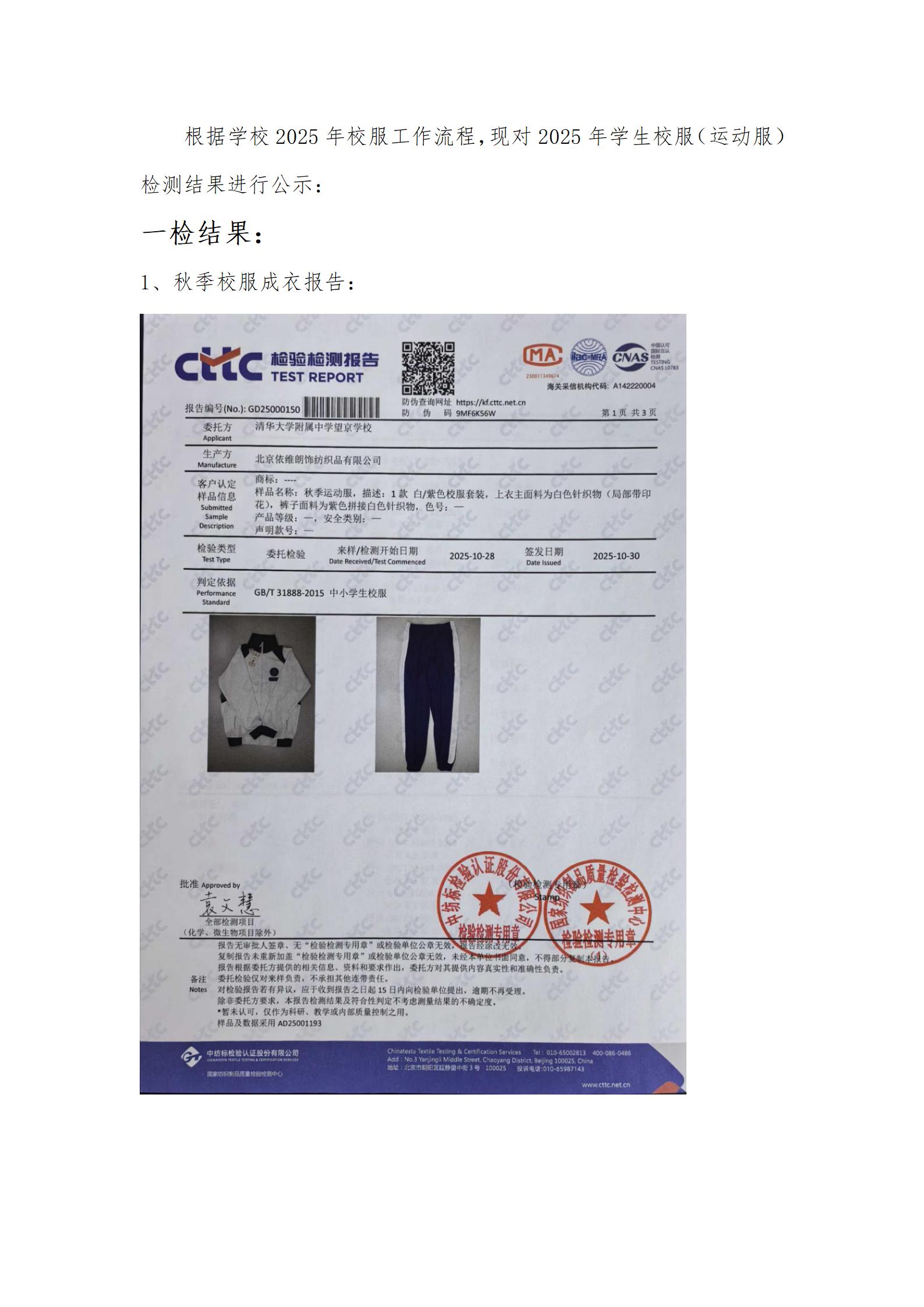 清华大学附属中学望京学校 2025年学生校服(运动服)检测结果(双送检)公示